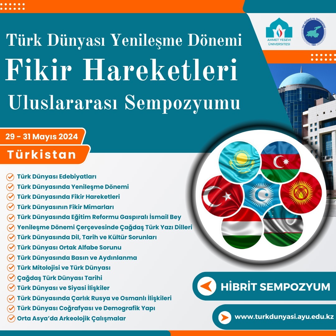 Van Yüzüncü Yıl Üniversitesi ile Hoca Ahmet Yesevi Uluslararası Türk-Kazak Üniversitesi, 29-31 Mayıs 2024 tarihlerinde Türkistan da Türk Dünyası Yenileşme Dönemi Fikir Hareketleri Uluslararası Sempozyumu gerçekleştirecektir.