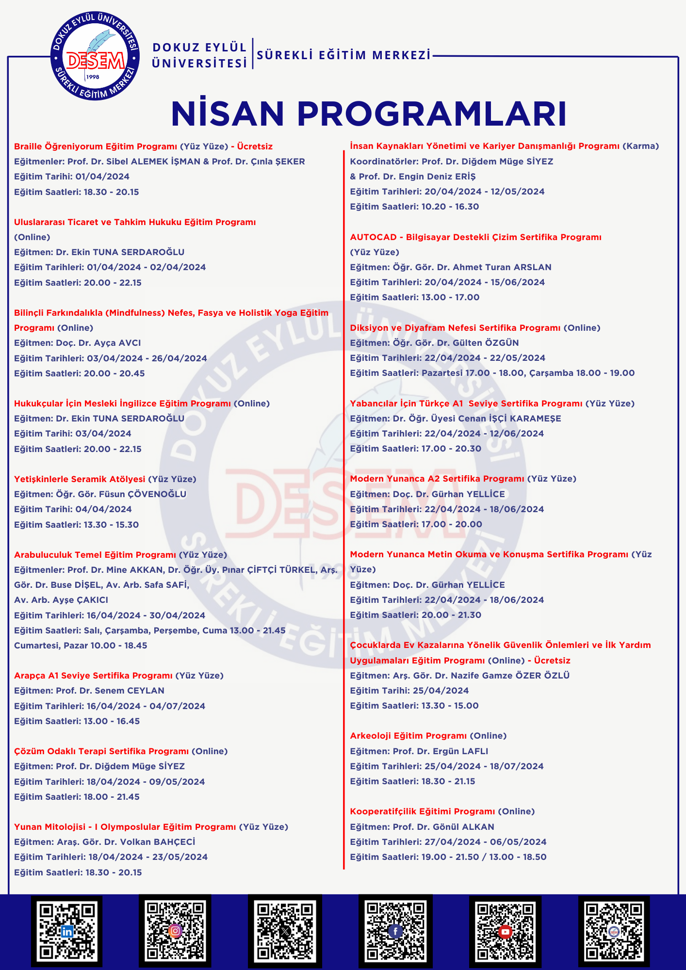 Dokuz Eylül Üniversitesi Sürekli Eğitim Merkezi 2024 Yılı Nisan Programları